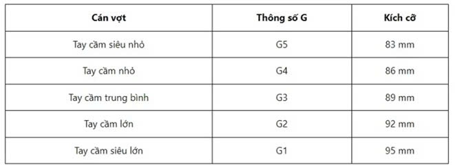 Ngoài ra, kích thước tay cầm của vợt được đo bằng cách thêm số vào sau “G”. Số này biểu thị kích thước của tay cầm, và quy tắc chung là số càng nhỏ, tay cầm càng lớn.